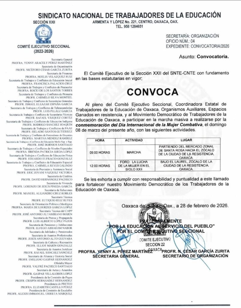 El documento fue emitido en Oaxaca de Juárez con fecha 28 de febrero de 2026 y lleva las firmas de la Secretaría General y la Secretaría de Organización de la Sección XXII.